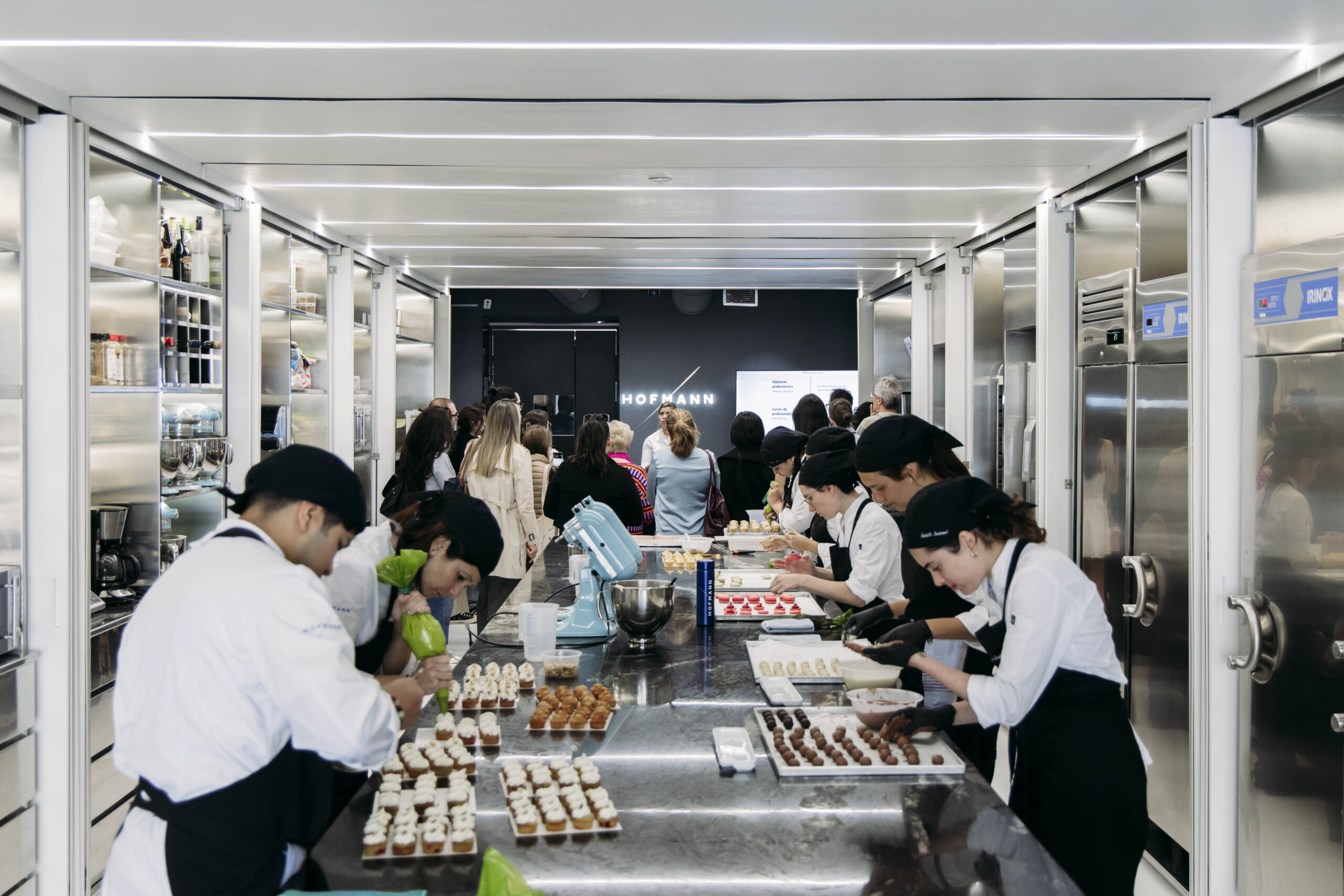En el área de pastelería, nuestra profesora del Gran Diploma de Pastelería y Repostería, Elena Adell, presentó en detalle la formación disponible, mientras varios alumnos mostraban en vivo la experiencia Hofmann elaborando diferentes recetas reposteras.